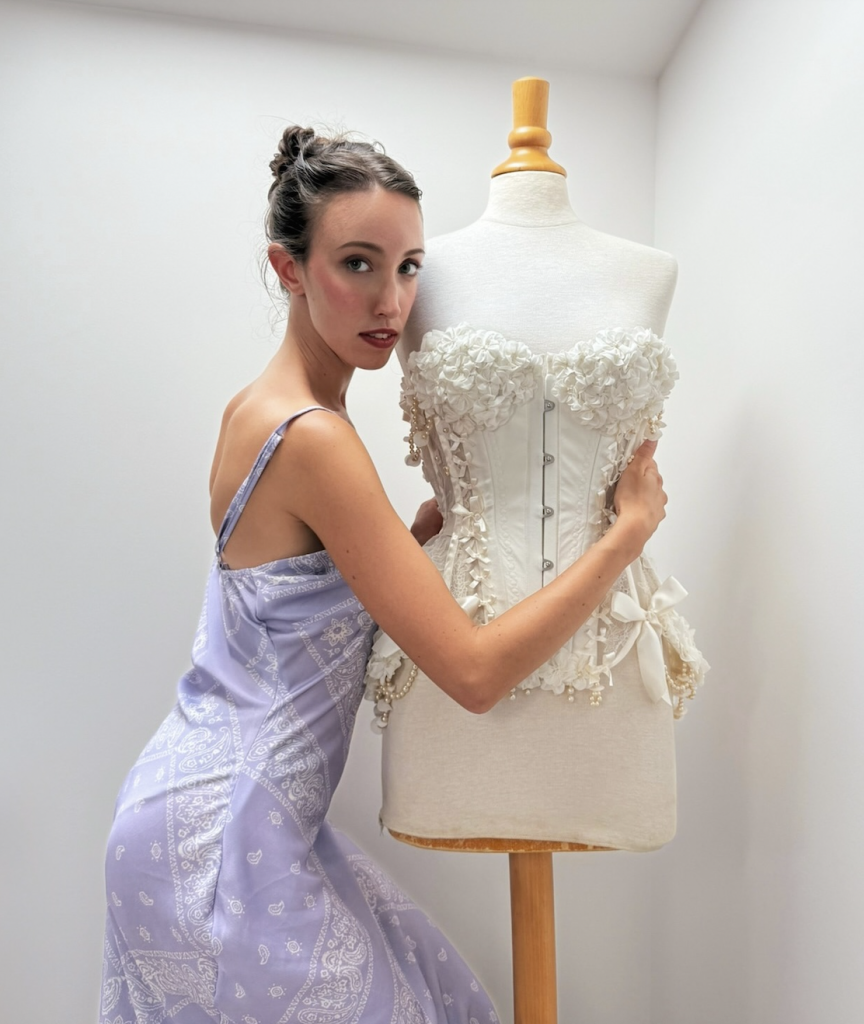 Les corsets, pièce emblématique de mon travail, sont construits selon des techniques traditionnelles : baleines en acier, tissus haute tenue, montage interne méticuleux. Chaque robe est pensée avec la même rigueur architecturale, afin d’offrir une pièce d’une tenue impeccable, qui se porte avec grâce et aisance.