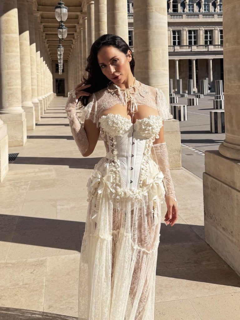 Dione est une création corsetée d’exception, pensée comme une sculpture textile. Le corset, pièce centrale, est entièrement brodé de pétales de tissus délicatement superposés, rehaussés de perles et de rubans cousus à la main. Des incrustations de dentelle viennent enrichir la matière et créer un jeu de transparence subtil, apportant profondeur et raffinement à la silhouette. Dione s’accompagne d’une jupe en dentelle fluide, d’un caraco assorti et de gants en dentelle, formant un ensemble harmonieux où chaque élément dialogue avec l’autre dans une même finesse.