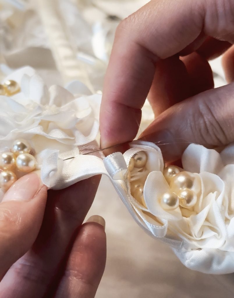 - Essayages couture – Plusieurs essayages ponctuent la création, permettant d’affiner la ligne, dans le respect des codes de l’artisanat d’excellence.